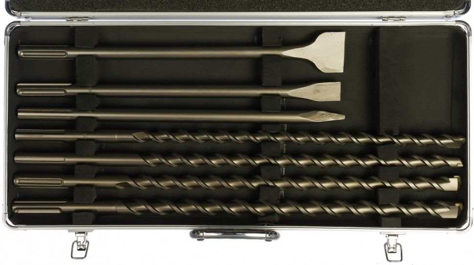 4 бура SDS-max: 18х540 мм; 20х540 мм; 22х540 мм; 25х540 мм; 1 пика длиной 400 мм; 2 лопаточных долота длиной 400 мм, металлический кейс