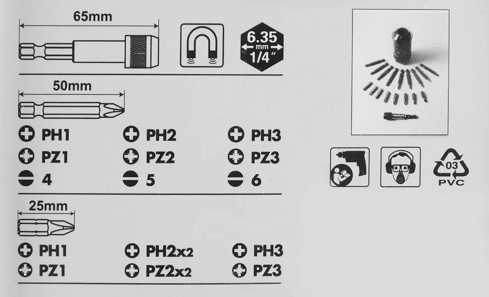 25 мм биты: PH1, PH2x2, PH3, PZ1, PZ2x2, PZ3